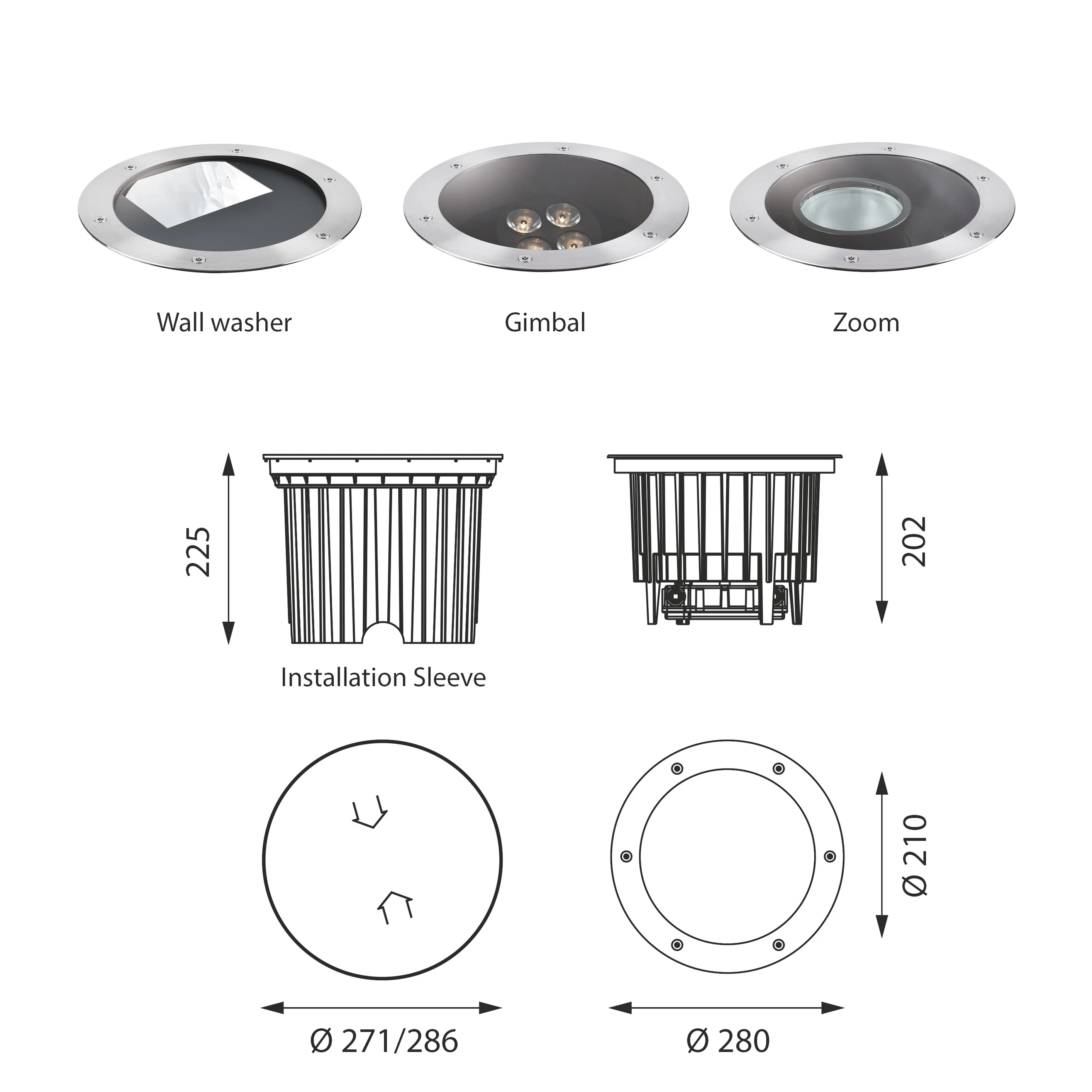 Finish Glass, stainless steel. Materials Housing: Injection moulded anodised aluminium. Top ring: Brushed stainless steel, 316L. Glass: Extra clear,hardened glass. Driver box: Synthetic. Installation sleeve: Synthetic. Sizes and weights: Width x Height x Length (mm) | 280 x 2 x 280 Max 6.0 kg Class: Ingress protection IP66, IP67, IP69K. IK10. Electric shock protection II wo. ground. Light source:LED 3000K 37W Lumen: 2017